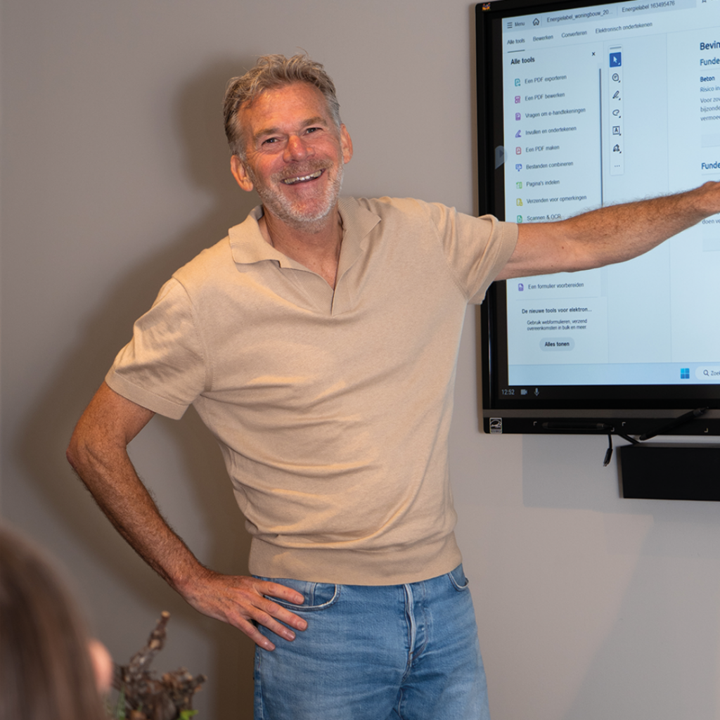 Zodra je op kantoor aankomt, pak je een kop koffie en praat je bij met een collega die gisteren op pad was voor video opnames. Je gaat aan de slag met de voorbereidingen voor een vergadering, waarin je een voorstel voor het verbeteren van de klantreis voor de bouwkundige keuring gaat presenteren. Je brengt hiervoor o.a. in kaart wat hier qua software ontwikkeling voor nodig is en wat het gaat opleveren. De dag vliegt voorbij!